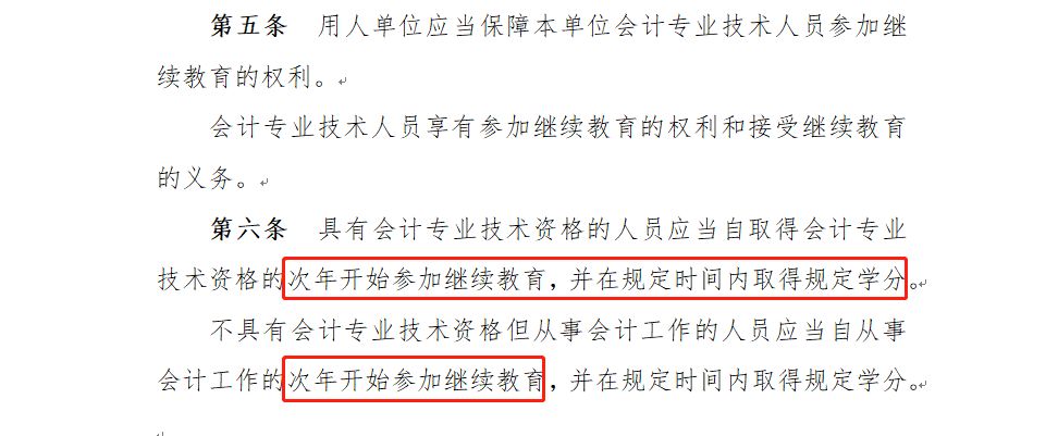 什么时间参加继续教育?第二年!根据《会计专业技术人员继续教育规定》第六条规定: